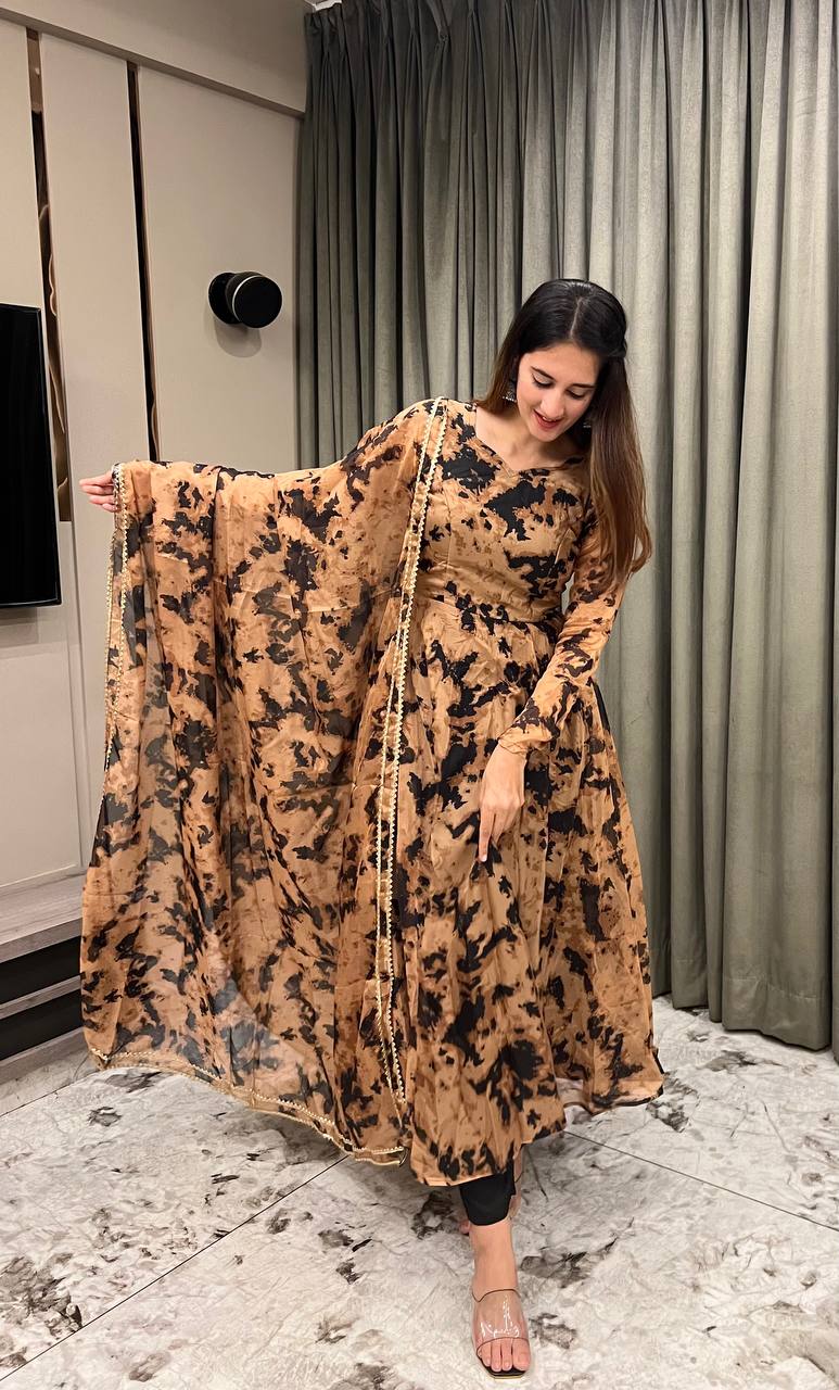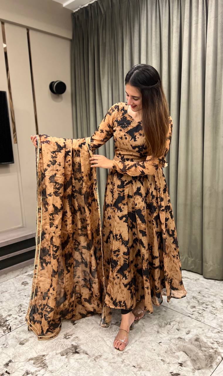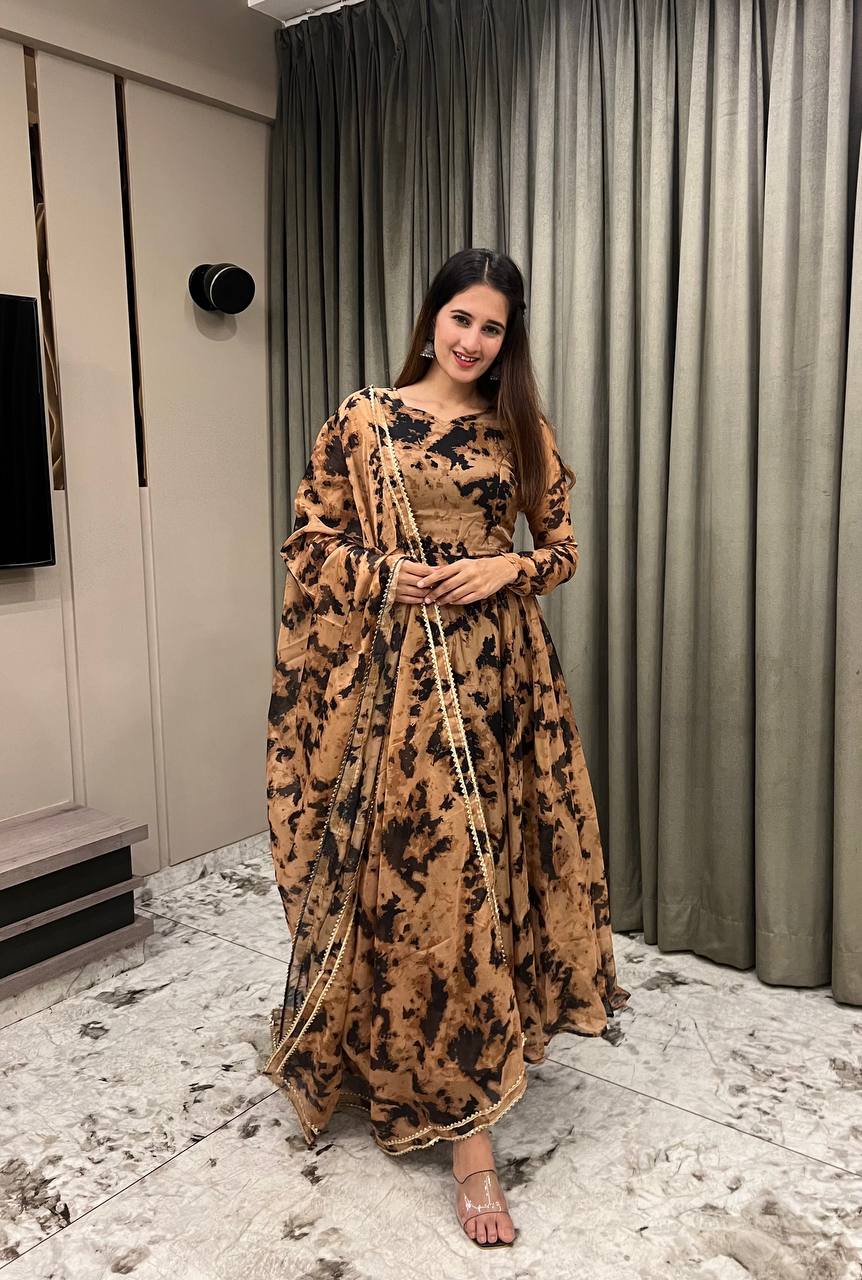 Coffee Printed Anarkali Gown With Pant & Dupatta Set