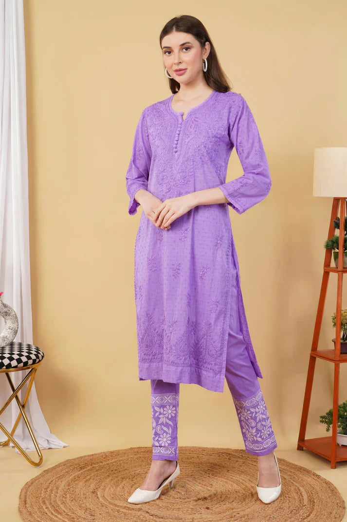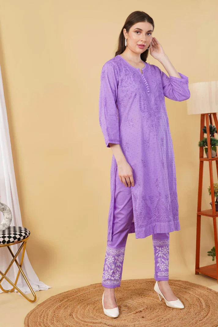 Dyed Cotton Chikankari Kurti & Lycra Pant Set, Pockets Both Side of the Pant