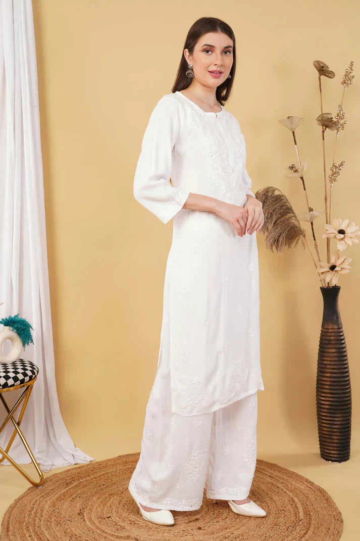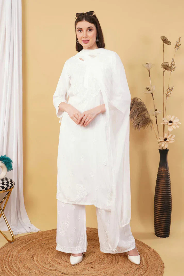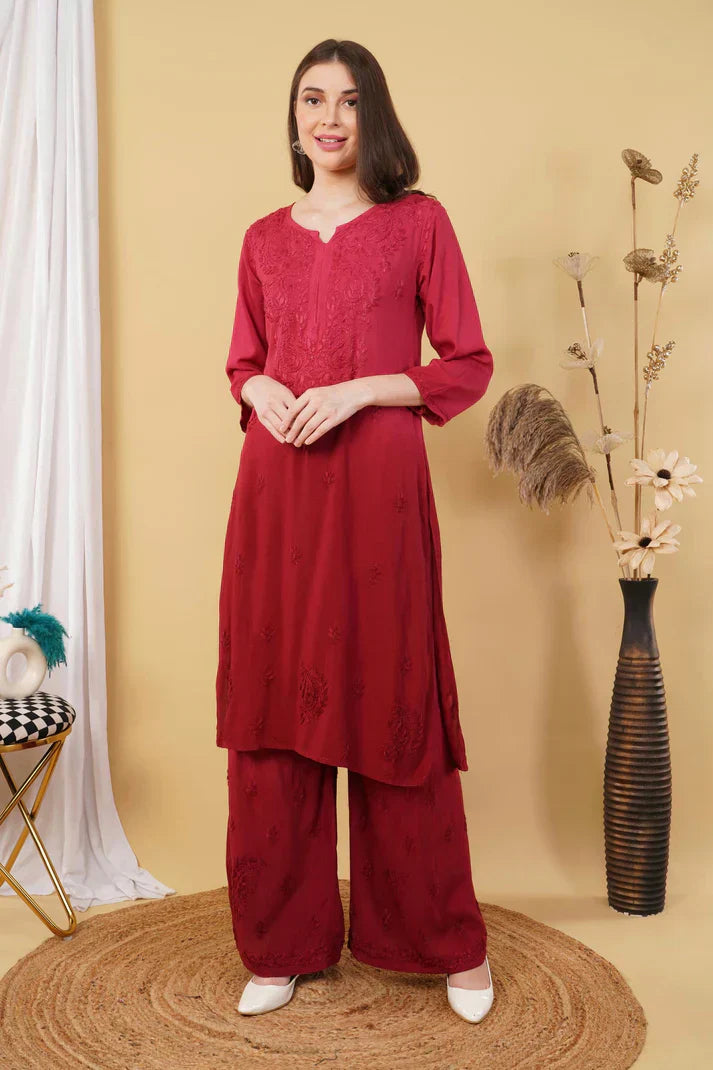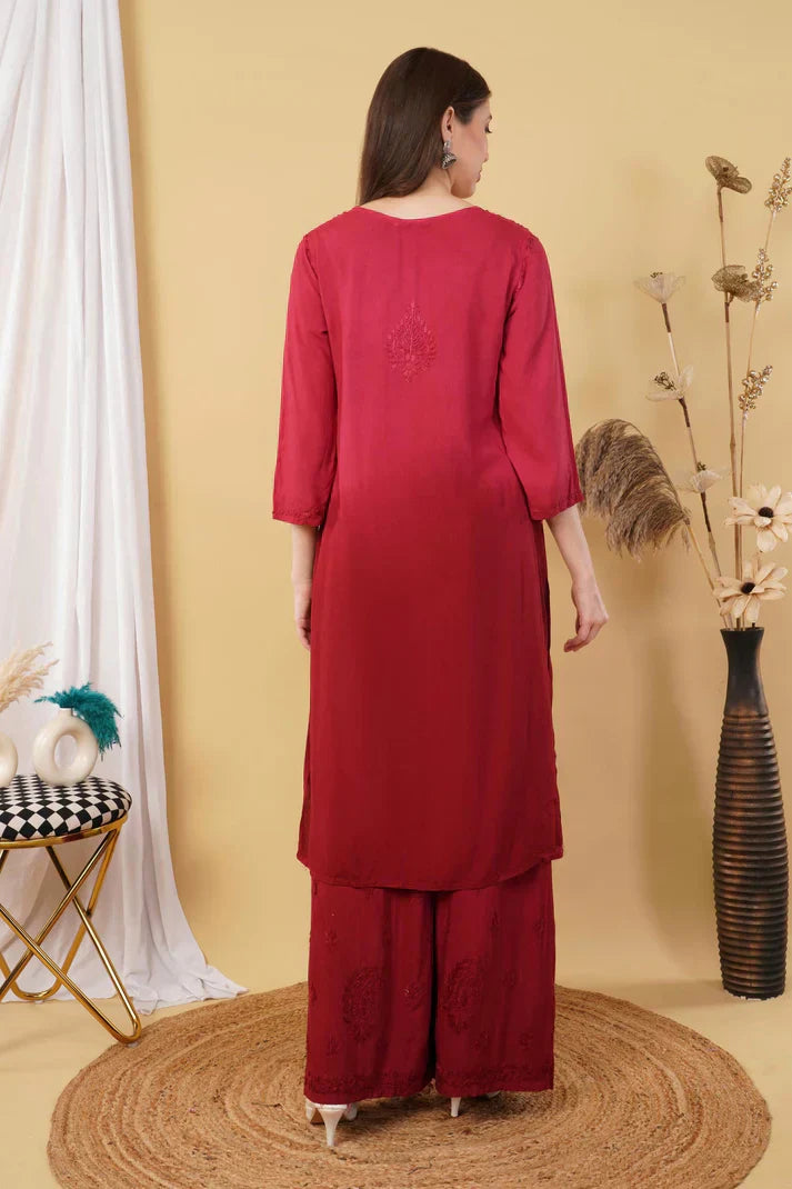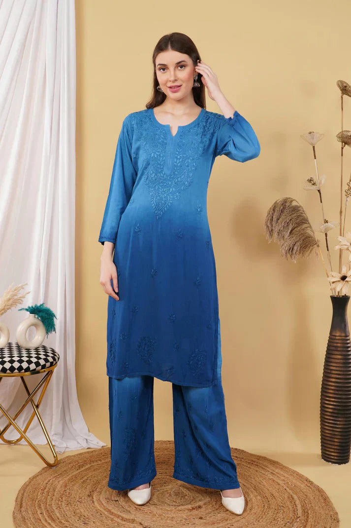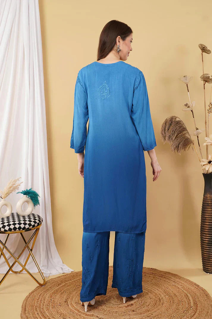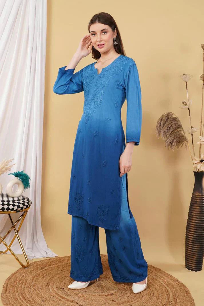Ombre Dyed Shaded Rayon Chikankari Kurti, Palazzo and Dupatta Set.