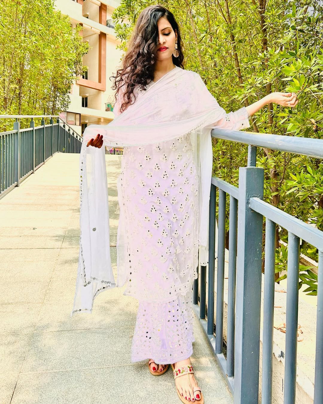 ✔ 4-Piece Set with Soft Cotton Inner: Includes a kurti, sharara, mirror-laced dupatta, and a soft free matching cotton inner for comfort and full coverage.