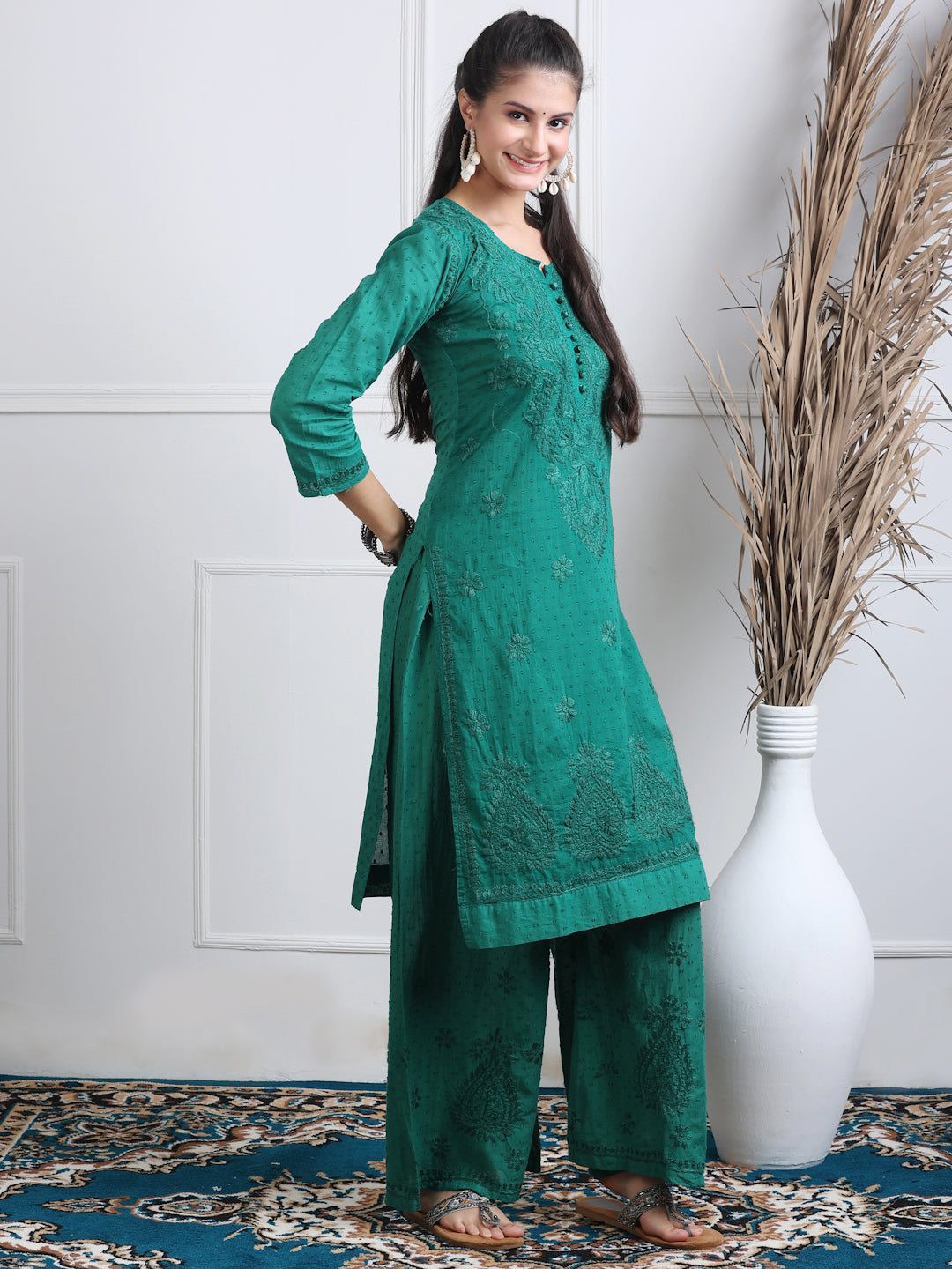 Women’s Dyed Lucknowi Chikankari Cotton Kurti, Palazzo & Dupatta Set
